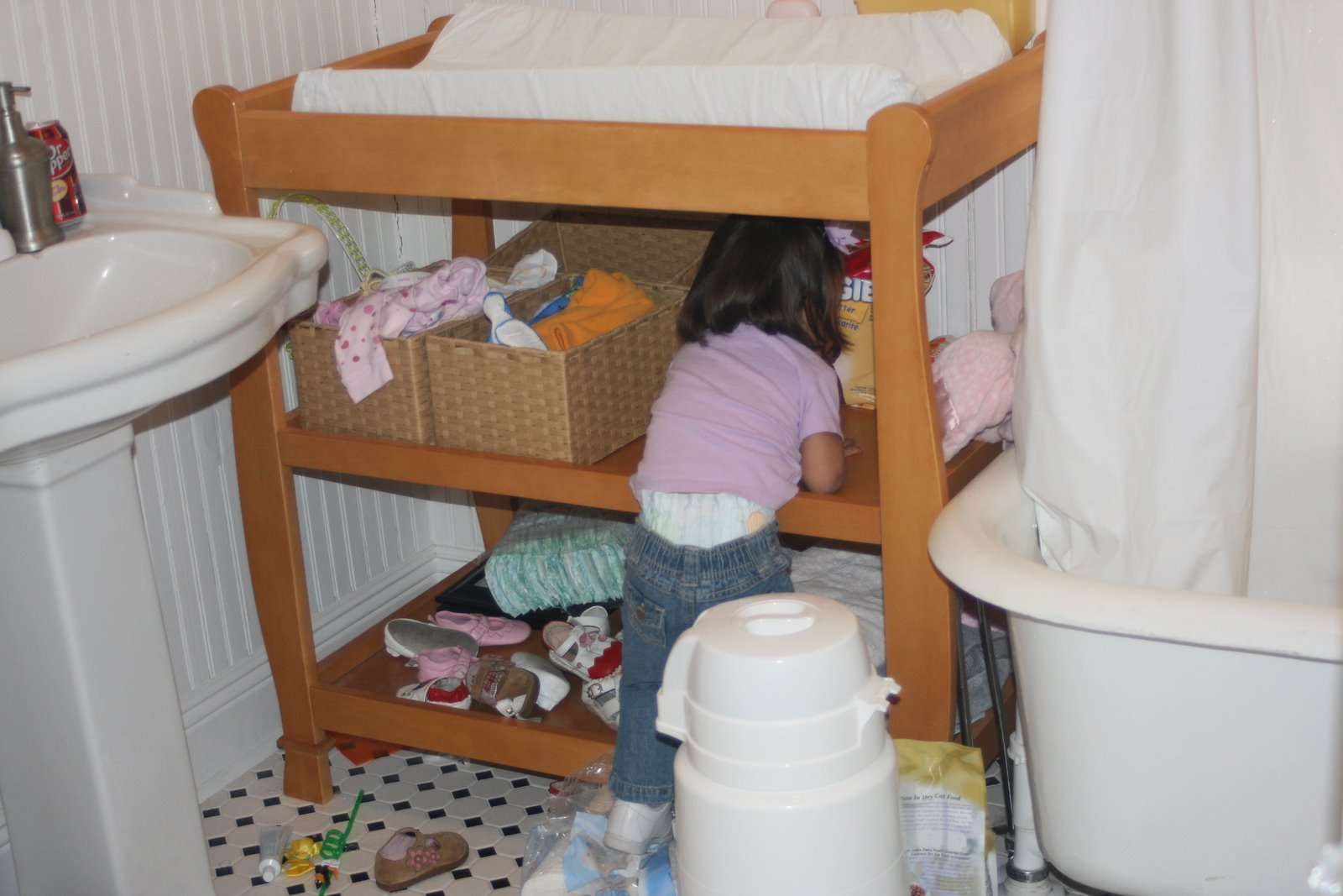 In retrospect, I'm not sure why I ever thought an open changing station was a good idea. I've spent the better part of seven months imploring certain members of our family to please not throw the diapers, shoes, towels, etc. on the floor while mommy dries her hair.